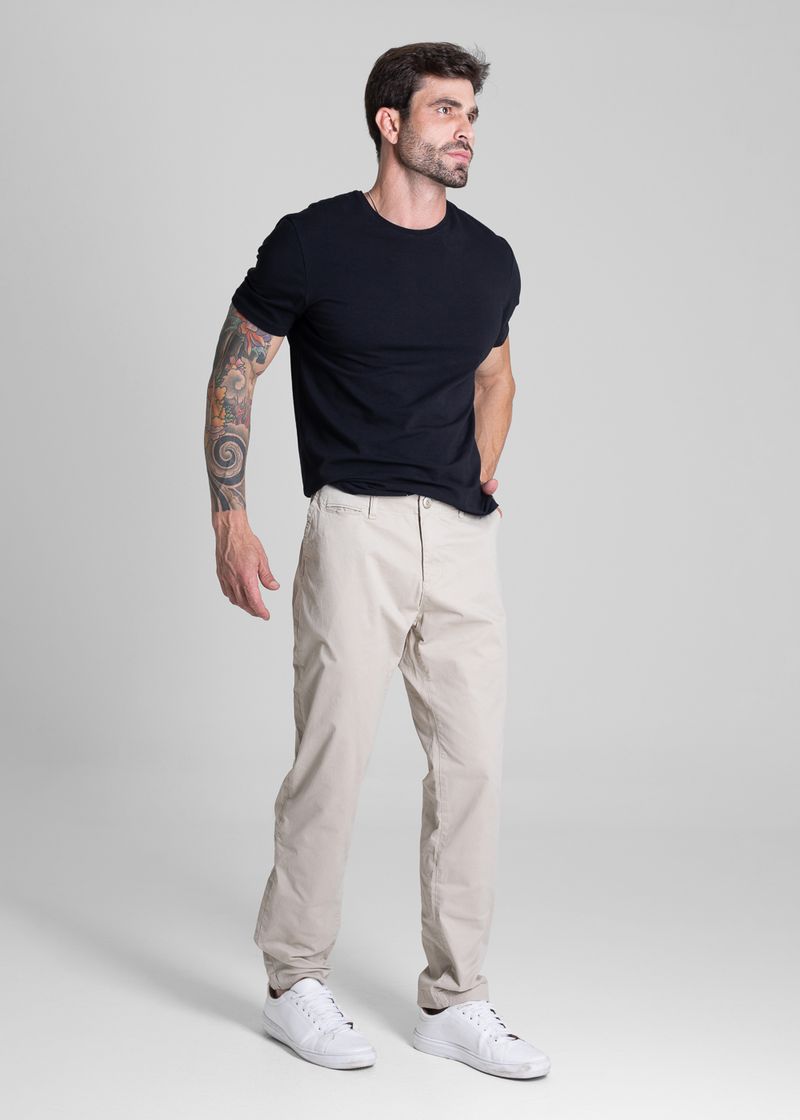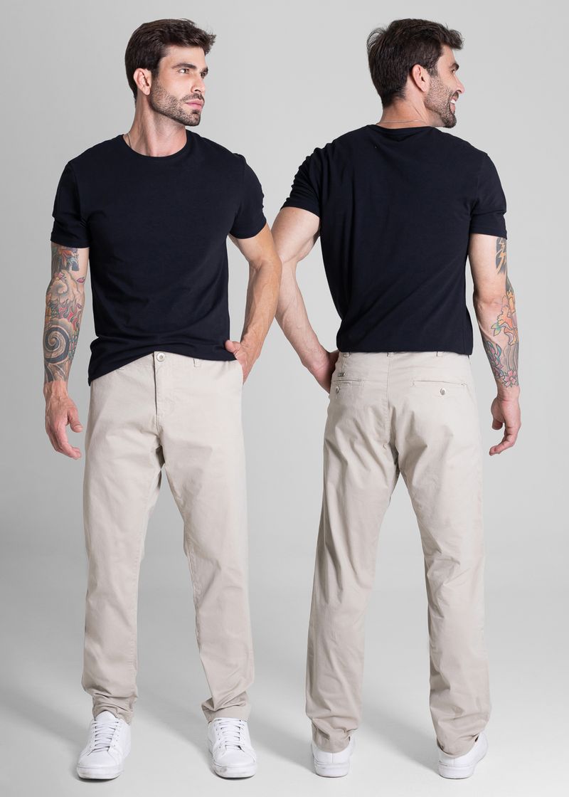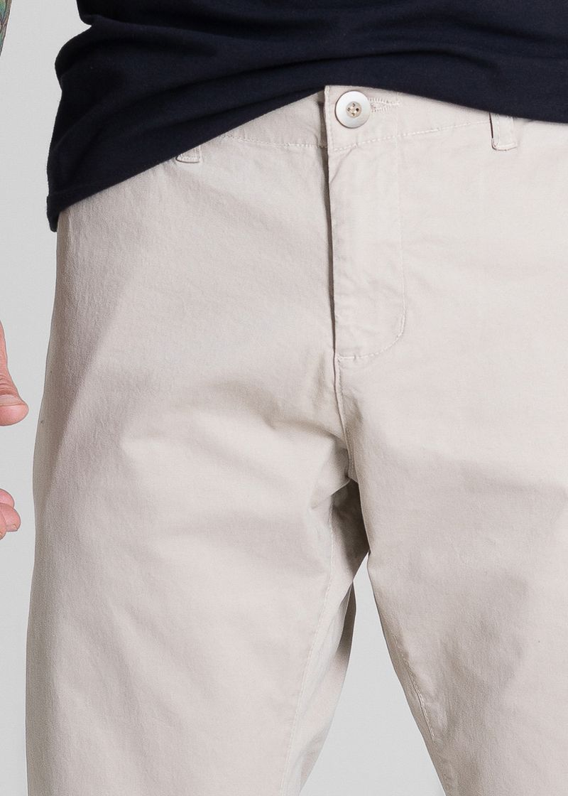 Calça slim confeccionada em sarja . Modelagem ajustada até a barra. Cintura média Fechamento com botão metálico e zíper Bolsos frontais faca e bolsos protetores Barra simples Modelagem: Men slim Tecido: Sarja Tipo de lavagem: color Cor: bege