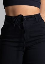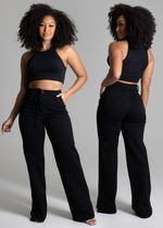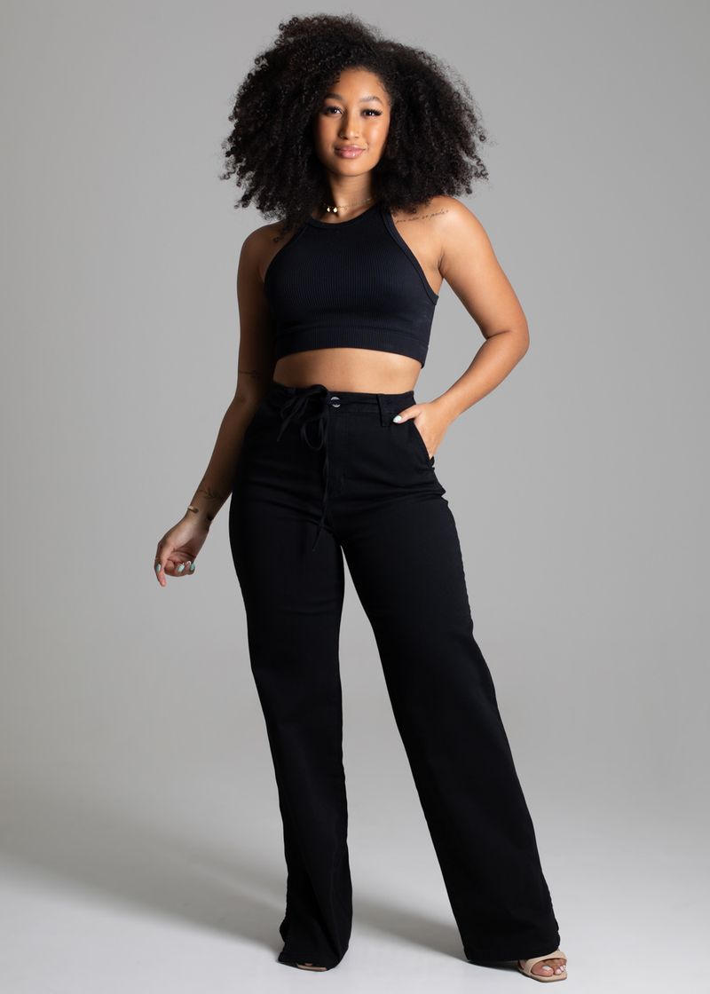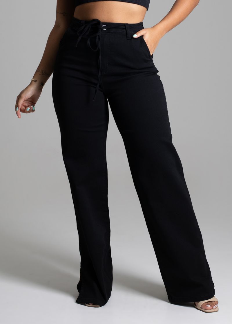 Calça feminina confeccionada em sarja. O modelo possui cintura super alta, gancho no lugar e caimento amplo da coxa até a barra. Cintura alta Fechamento através de um botão e zíper Bolsos frontais e posteriores funcionais Barra simples Tecido: sarja Tipo de Lavagem: color Cor: preta