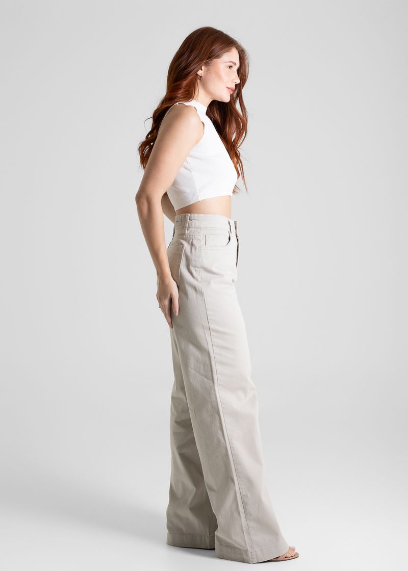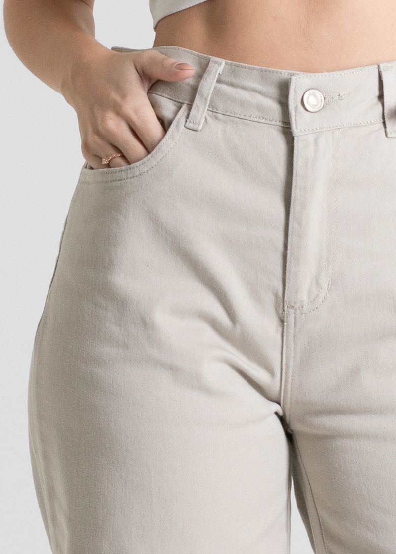 Calça feminina confeccionada em sarja. O modelo possui cintura super alta, gancho no lugar e caimento amplo da coxa até a barra. Cintura alta Fechamento através de um botão e zíper Bolsos frontais e posteriores funcionais Barra simples Tecido: Sarja Tipo de Lavagem: Color Cor: Areia