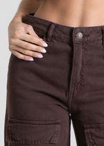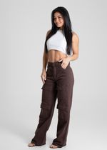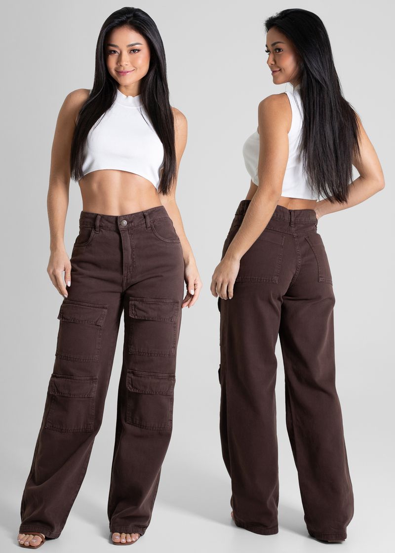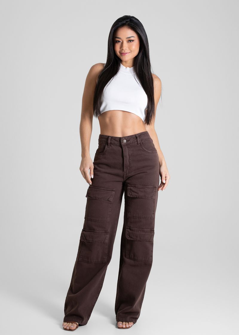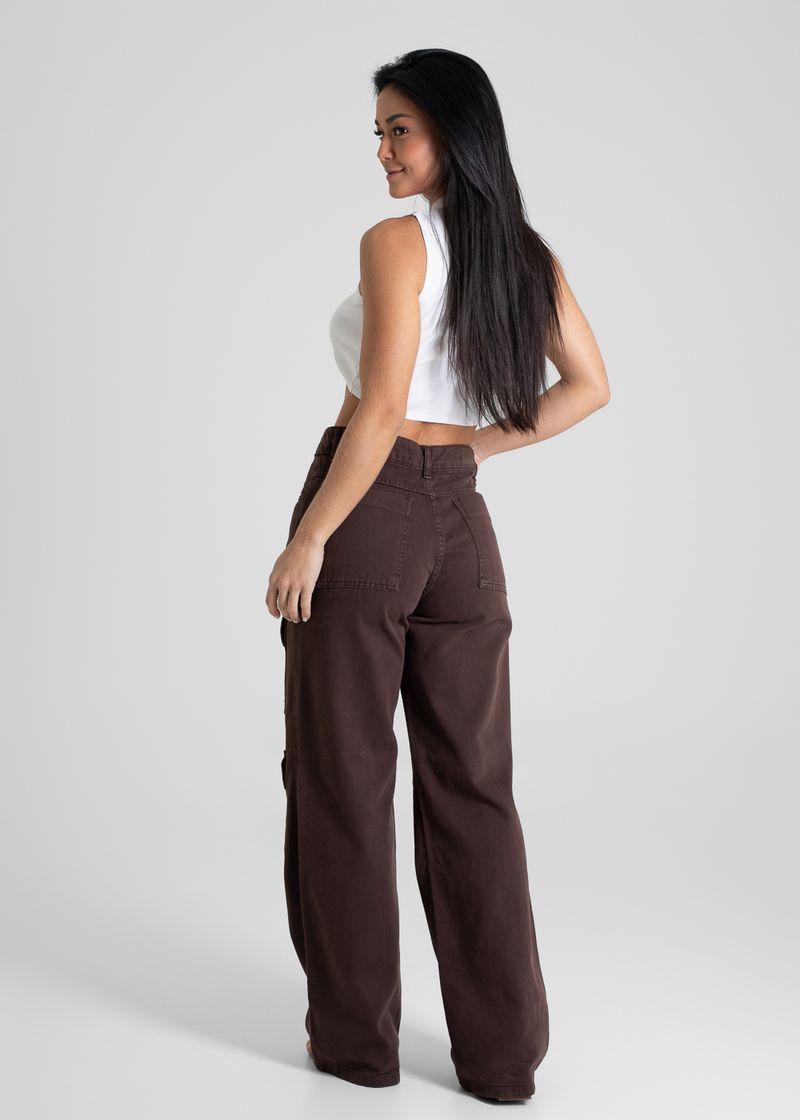 Calça feminina confeccionada em sarja. O modelo possui cintura super alta, gancho no lugar e caimento amplo da coxa até a barra. Cintura alta Fechamento através de um botão e zíper Bolsos frontais e posteriores funcionais Barra simples Tecido: Sarja Tipo de Lavagem: Color Cor: Marrom