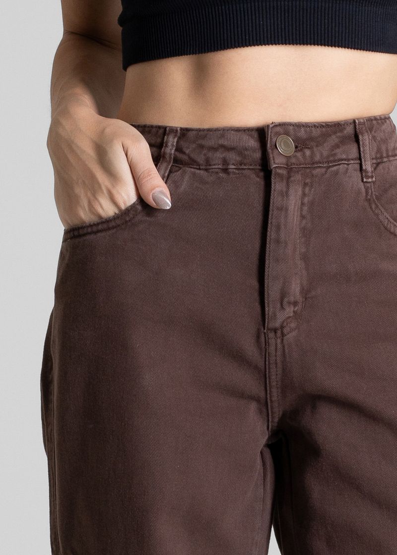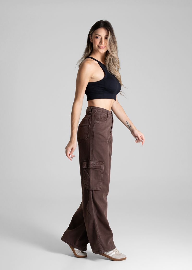 Calça feminina confeccionada em sarja. O modelo wide leg possui cintura alta, gancho no lugar e caimento amplo da coxa até a barra. Cintura alta com cinto lateral Bolsos cargo laterais, frontais e posteriores funcionais Barra simples Tecido: Sarja Tipo de Lavagem: Color Cor: Marrom