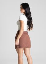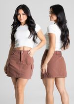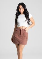 Saia mini feminina confeccionada em sarja O modelo tem comprimento curto e caimento ajustado. A parte frontal tem fechamento com botão e zíper Bolsos frontais falsos e laterais cargo funcional A barra tem acabamento simples Tecido: Sarja Tipo de lavagem: Color Cor: marrom