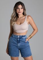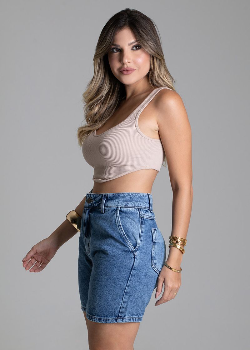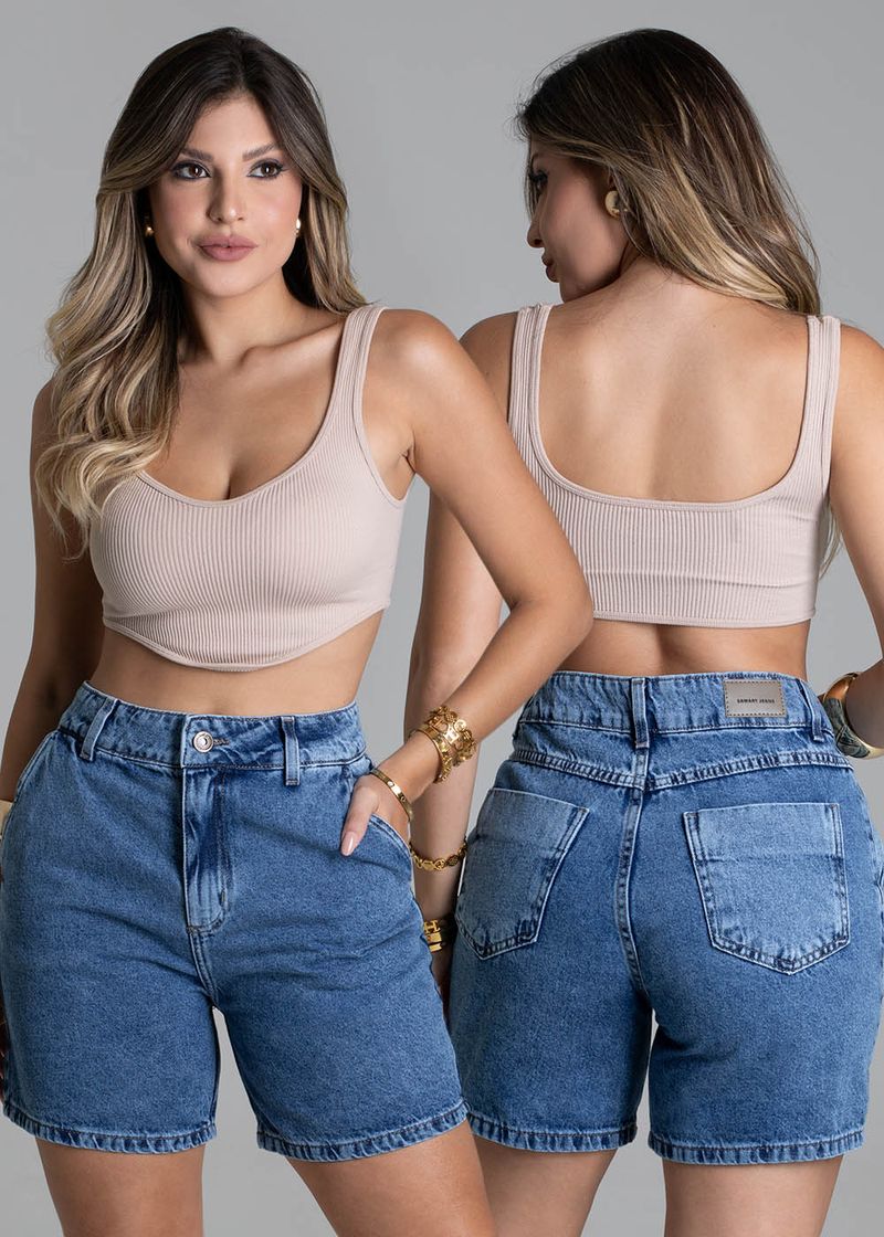 Shorts confeccionada em jeans. Modelagem soltinho. Cintura média Fechamento com botão e zíper Bolsos frontais faca e bolsos traseiros funcionais Barra simples Tecido: Jeans Tipo de lavagem: Azul Cor: Azul médio