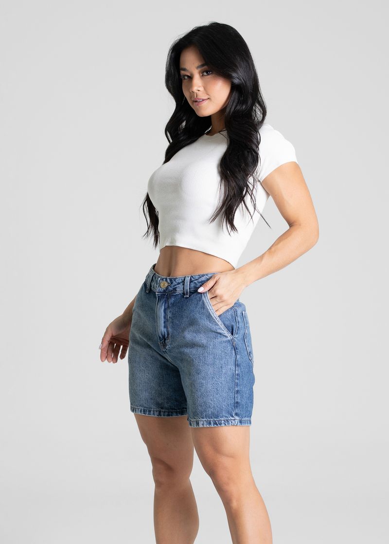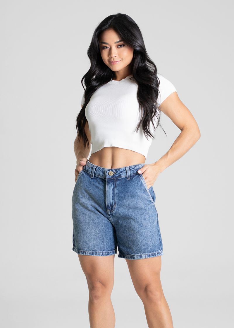 Shorts confeccionada em jeans. Modelagem soltinho. Cintura média Fechamento com botão e zíper Bolsos frontais faca e bolsos traseiros funcionais Barra simples Tecido: Jeans Tipo de lavagem: Azul Cor: Azul médio