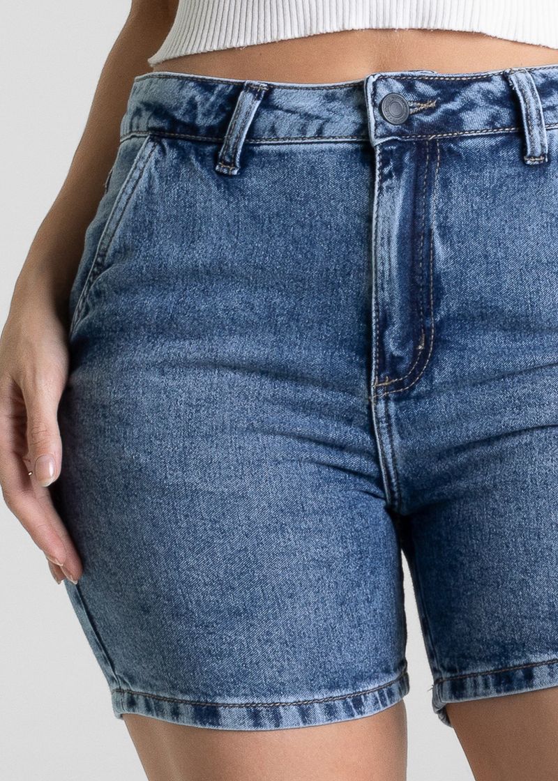 Shorts confeccionada em jeans. Modelagem soltinho. Cintura alta Fechamento com botão e zíper Bolsos frontais faca e bolsos traseiros funcionais Barra simples Tecido: Jeans Tipo de lavagem: Azul Cor: Azul médio