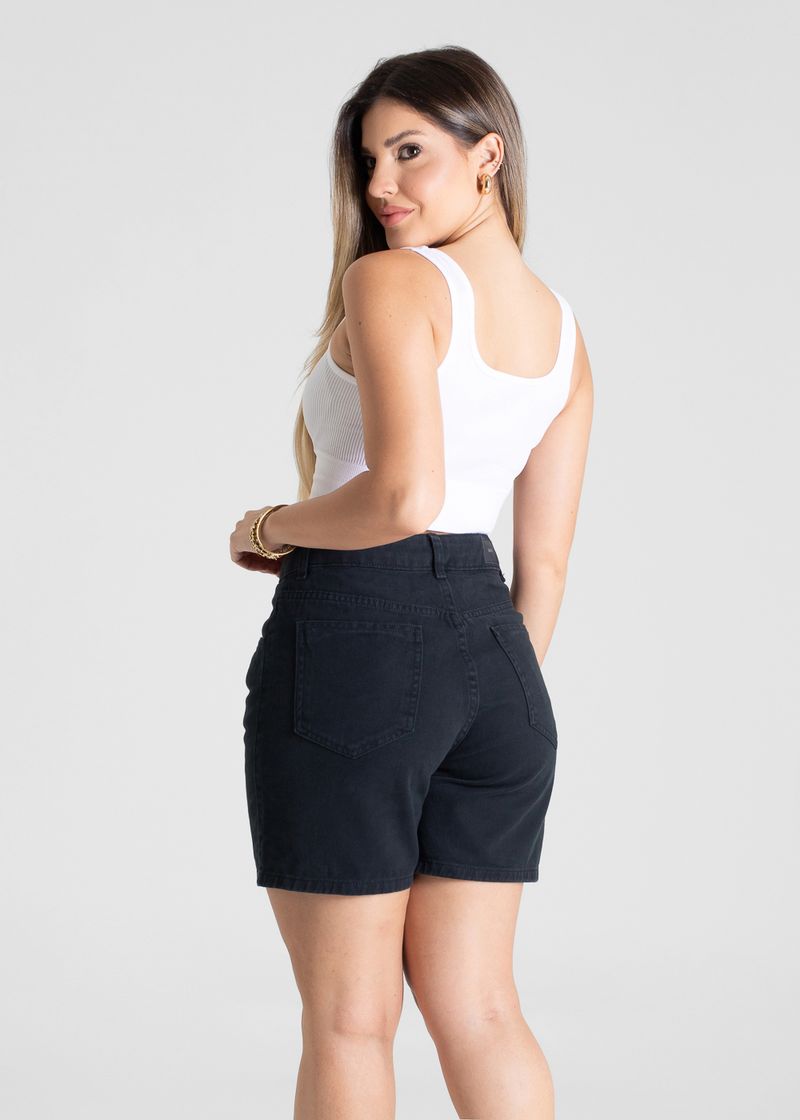Shorts confeccionada em jeans. Modelagem soltinho. Cintura alta Fechamento com botão e zíper Bolsos frontais e bolsos traseiros funcionais Barra simples Tecido: Jeans Tipo de lavagem: color Cor: Preto