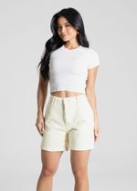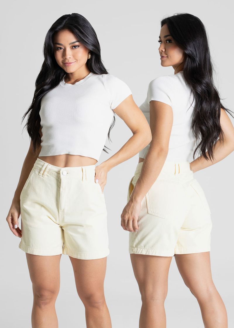 Shorts confeccionada em sarja. Modelagem soltinho. Cintura média Fechamento com botão e zíper Bolsos frontais e bolsos traseiros funcionais Barra simples Tecido: Sarja Tipo de lavagem: Color Cor: amarelo